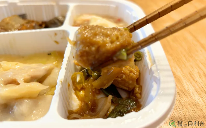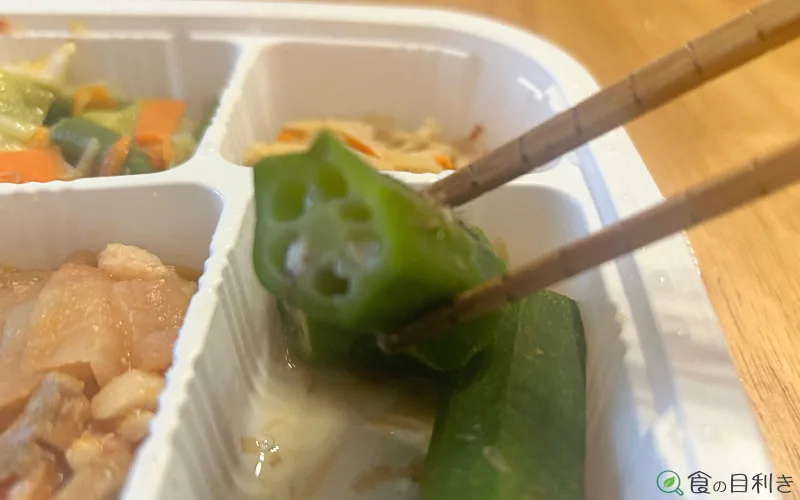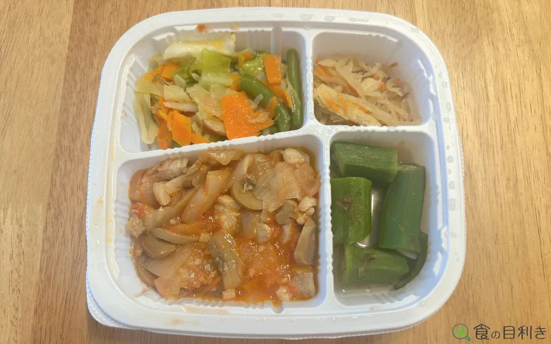制限食というと肉が硬くなりがちですが、鶏肉は全体的にしっとりしており、鶏ごぼうや鶏肉とキャベツの味噌炒めは食感面でも安心感がありました。噛み切れないほど硬い肉はなく、高齢者や噛む力が弱い人でも使いやすい印象です。