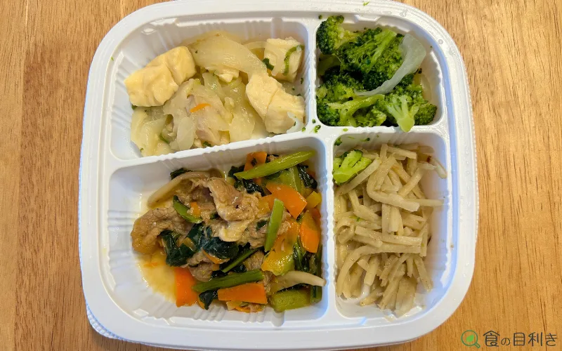 一方で、キノコ生姜炒めやイカと野菜の煮物は、食材は入っているものの存在感が弱く、「食感を楽しむ」料理ではありません。
